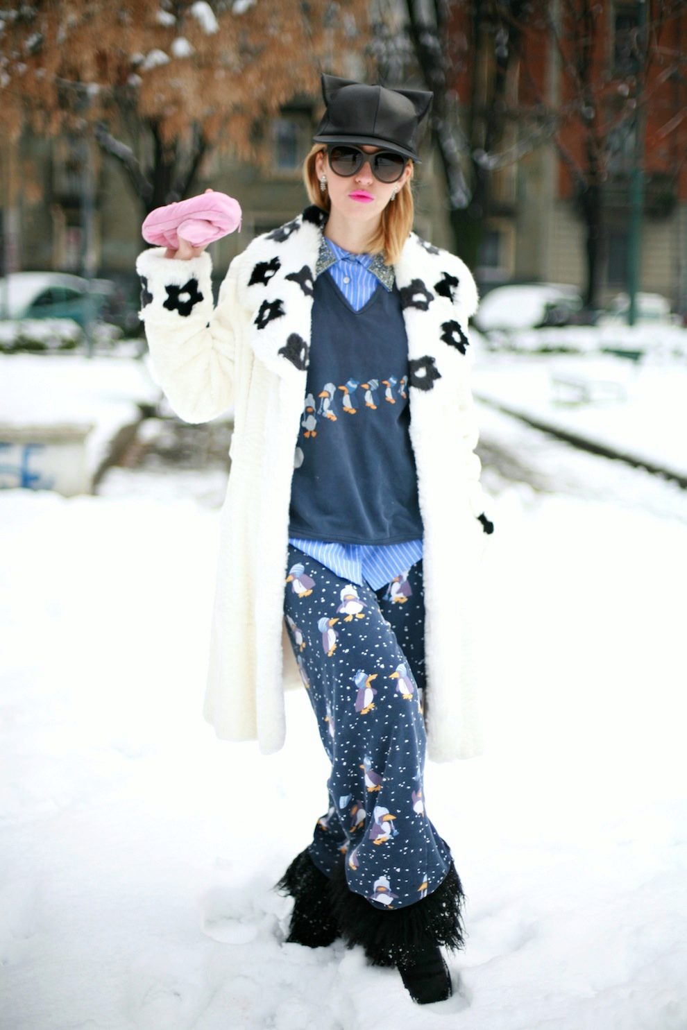 The fluffy fur trim emphasizes the elegance of the female leg.