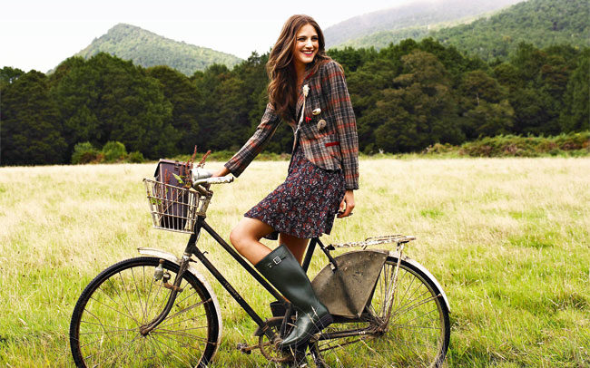 Wide boots emphasize the grace of the female leg. This slightly coarse shoe combines with a flared skirt in a small floral pattern and an elegant plaid jacket - a rather feminine and romantic outfit. There is a certain analogy with the image of the horsewoman - only the role of the horse is performed by the bicycle.