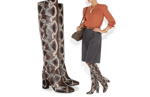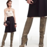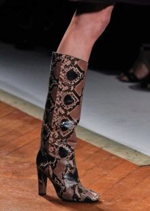 - Heeled boots with a texture under the skin of a reptile have acquired a new round of popularity. Universal black blends with most items in any wardrobe. Fashionable wide and massive heel gives stability in fact and figuratively. This heel is also covered with leather, which gives harmony to boots. The upper leg wraps around like a second skin. Effectively combined with dresses and skirts, both classic style and any other with a properly selected length. A great option for everyday life in the offseason.