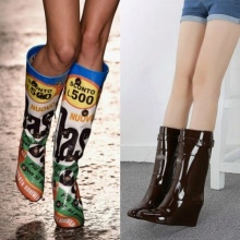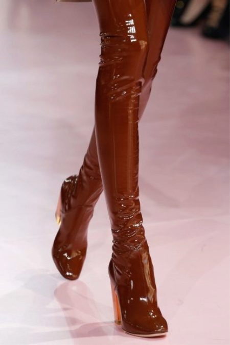 Shiny latex has become one of the most popular new products used in boots with heels. These boots fit the legs like a second skin and slim, and the brilliance of the material and its color gives an originality to the image. No less relevant are the various latex inserts in the boots in the form of strips, wedges, straps, toe or heel trim, tops.