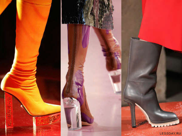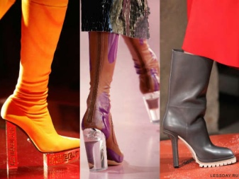 Transparent heels are increasingly common in boots, creating a feeling of weightlessness. Such a heel immediately attracts attention. It is made of glass, plastic. Decorated with various details - metal, stones, compositions.