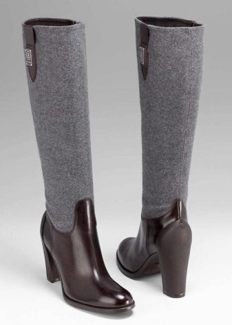 You can often see heeled boots with a combination of materials: leather and fur trim, leather and textiles, smooth leather and suede, etc.