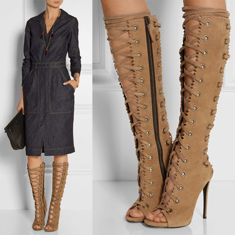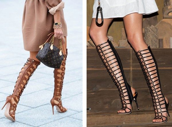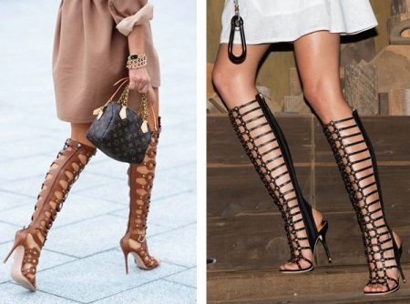 Summer boots with heels are variants of high-toed sandals, or high-grade boots made of lightweight materials - lace, silk, linen, perforated leather. Also popular models of summer boots in the form of "gladiators" with high lacing of leather straps, ropes and laces.