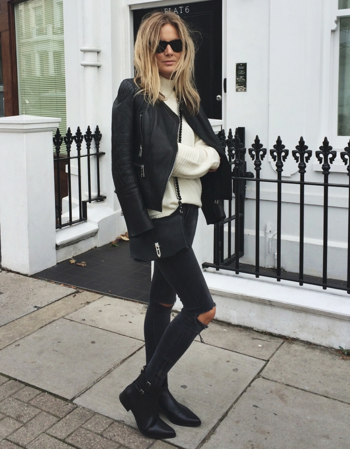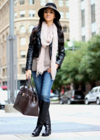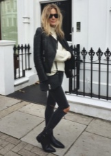 The biker style will be supported with torn jeans, bright t-shirts, leather jackets or vests. Treads and boots, stockings should be combined with short skirts and shorts, short outerwear, so that they do not block such elegant shoes.