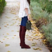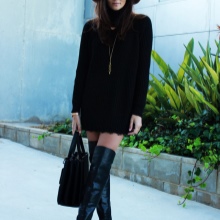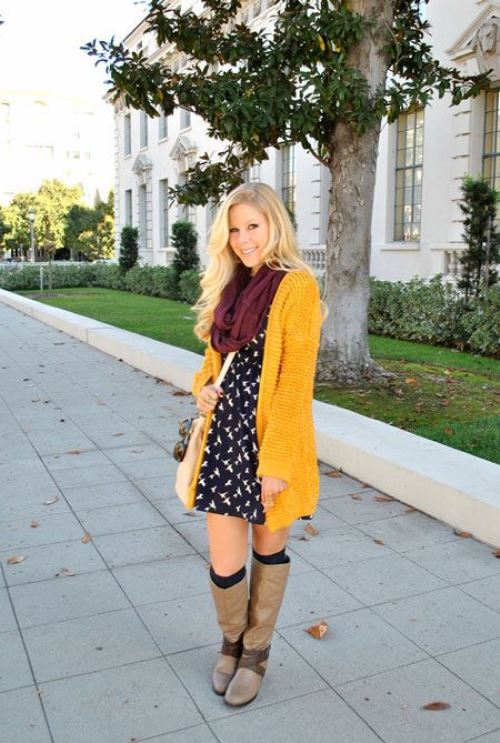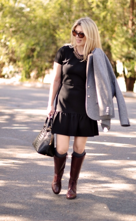 Flat shoes look great with feminine skirts. If we are talking about sexy boots, then you can wear a short skirt. Low boots will look great with a dress of medium length or just below the knee.