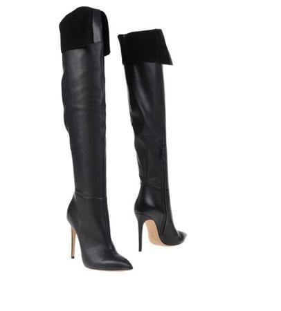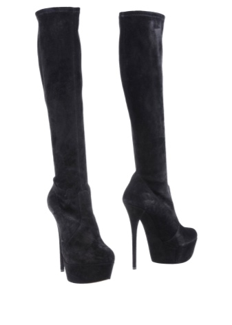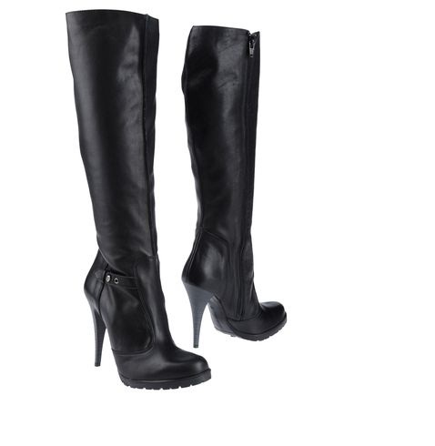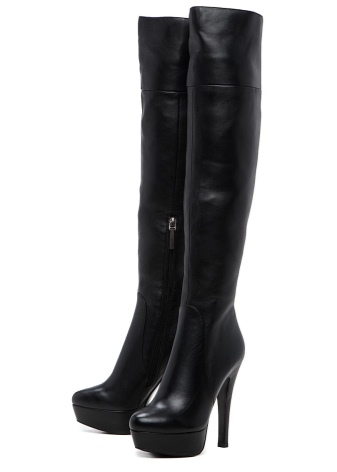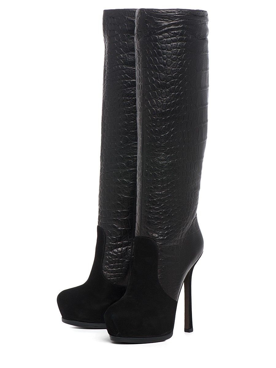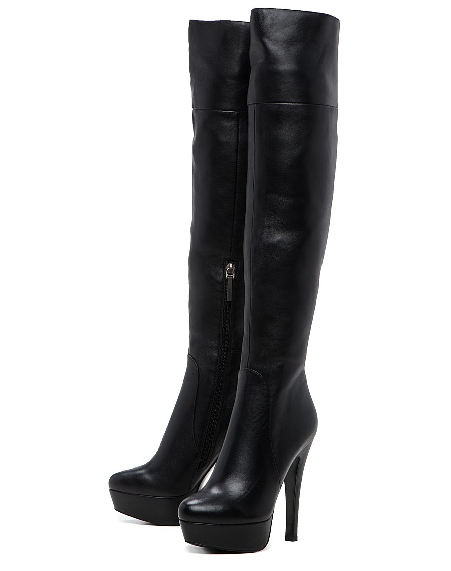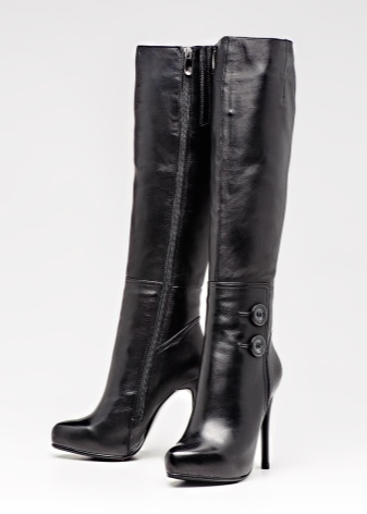 High pair of shoes can be worn with a long coat of a straight silhouette. Boots made from matte leather look harmoniously in combination with narrow black pants and a short light-colored fur coat.