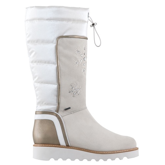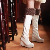 Feminine snow-white boots on a wedge with a corrugated sole can be worn at the first frost. It is better to combine shoes with a white short fur coat. The footwear has a light laconic design, suitable for everyday wear. In it you can go to visit, in a cafe or in the park for a walk.