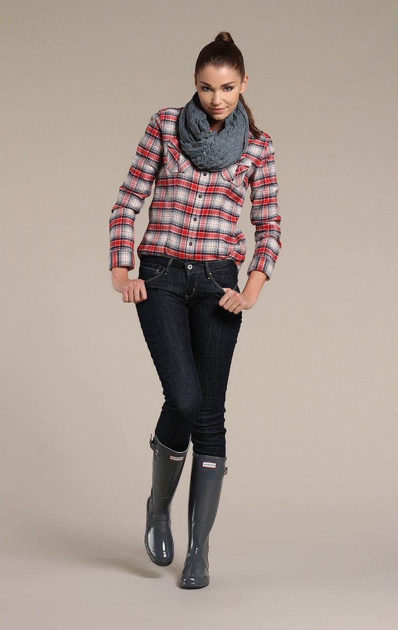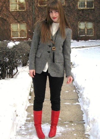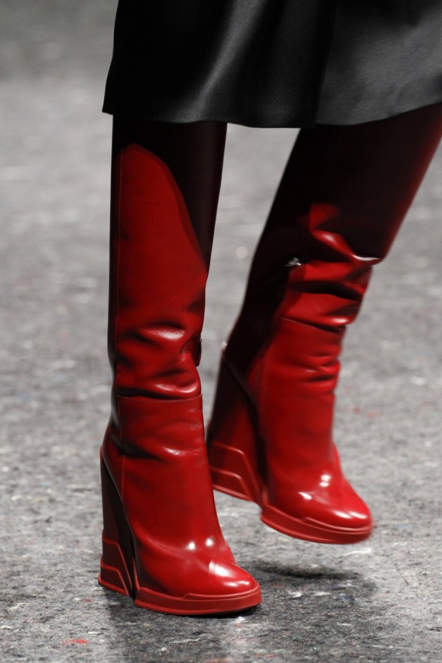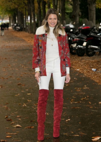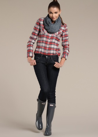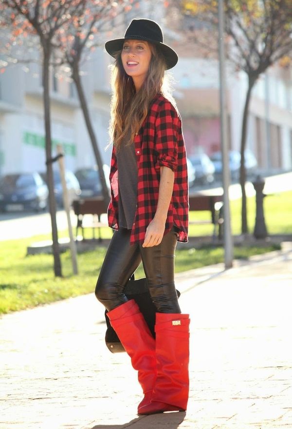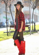 Red boots will be the brightest spot fashionable image. The rest of the entourage can be picked up in an unassuming color. Anyway, a bright focus on feet and shoes will attract everyone’s attention. The company they can make unless a red scarf or handbag in tone.