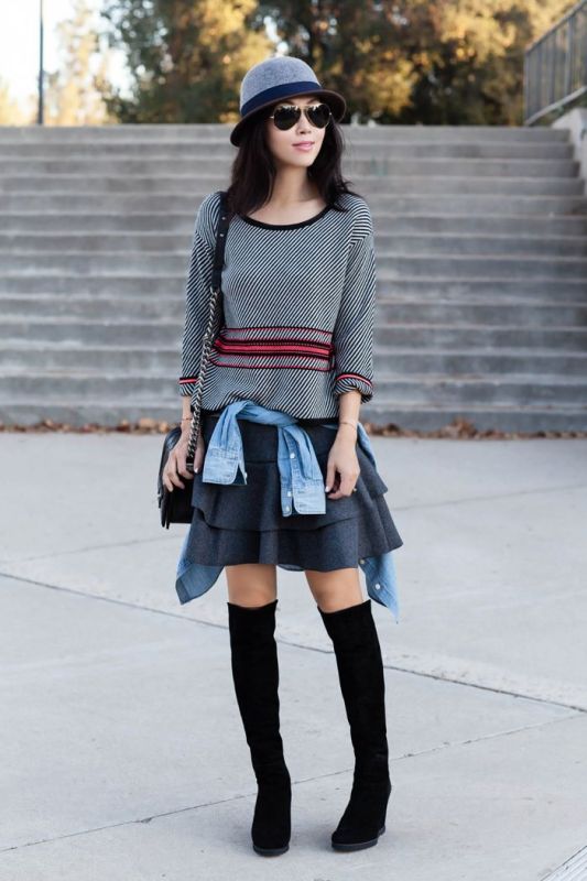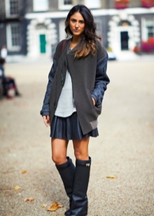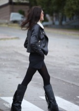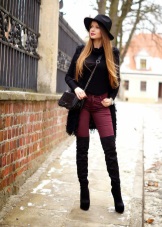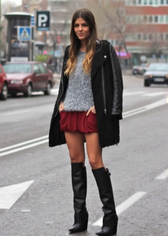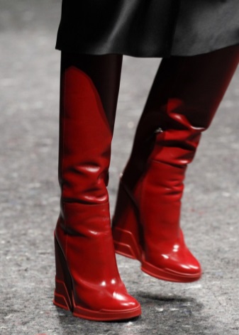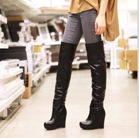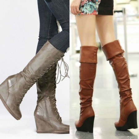 Selection of clothes and shoes in a fashionable combination is based on well-known principles. Top and bottom can be combined not only in color, but also in material. Boots on wedges are sewn of genuine leather, suede or raincoat fabric.