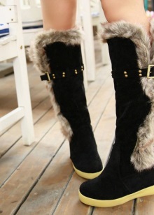 Winter boots on wedges also deserve attention. Here the sole of a curved shape has a denser structure to protect against the cold. The sole of most models of winter boots has a special ribbed non-slip surface. Stylish winter boots on the wedge can be successfully combined with a short fur coat or a short down-padded coat. Under the bottom you can wear a short wool dress.