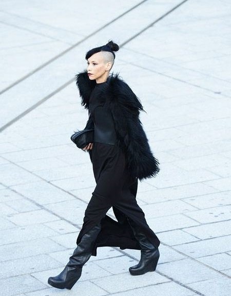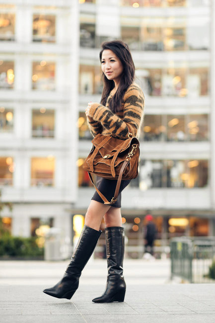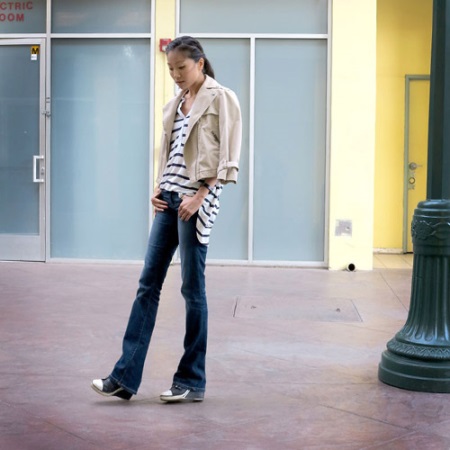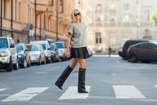 For the off-season, nice rubber wedge boots are great, which can be worn in combination with a cropped leather jacket.