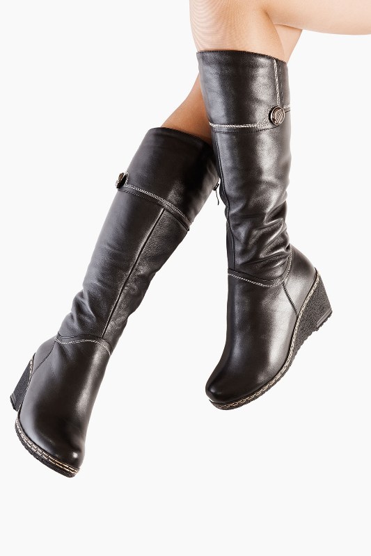 Classic black boots on a wide wedge and a snake are indispensable for daily commuting or walking. The footwear is comfortable because it has a steady heel, evenly distributing the load of the foot.