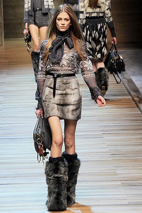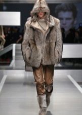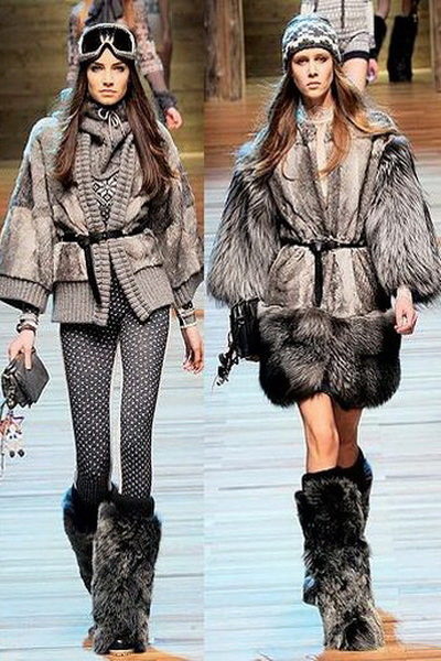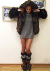 It would seem that coarse brown boots can be well combined only with trousers, but the woolen gray mini-dress also blends in very harmoniously with the modern look, and the fur top coat will add grace to the girl.