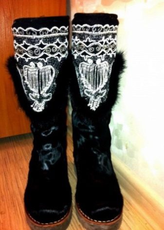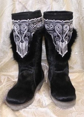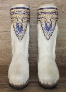 Men's boots are made using horizontal fur inserts in the front, between which fabric ribbons of blue, red and green colors fit very harmoniously. The name of the ornaments for men sound like “male head” and “bear ears”.