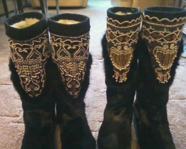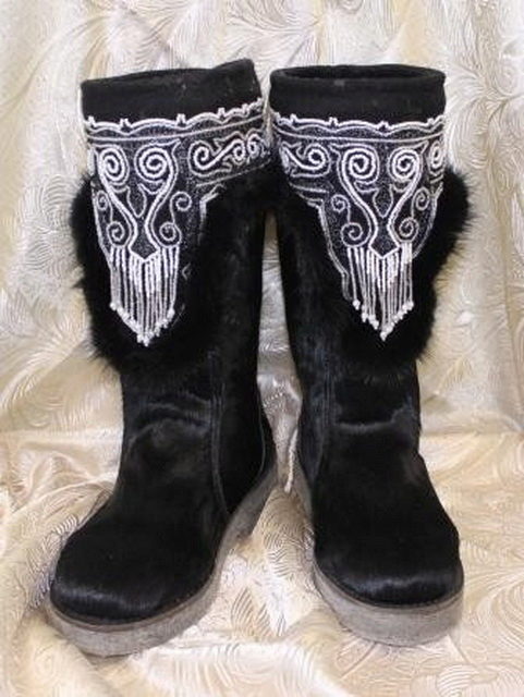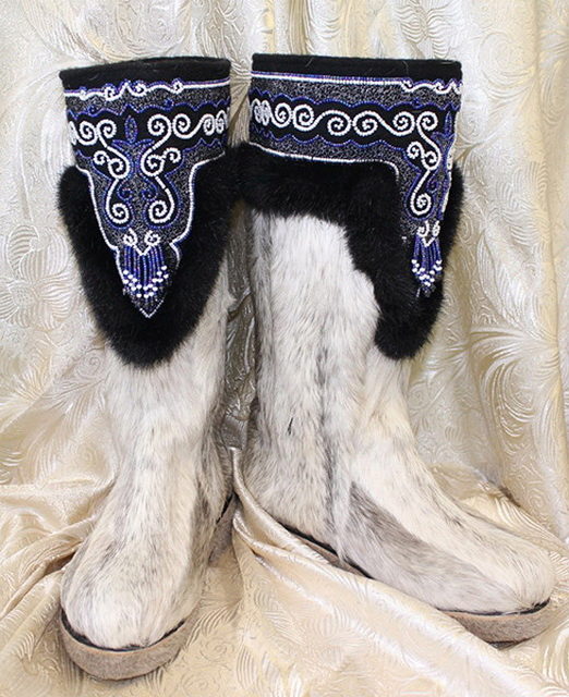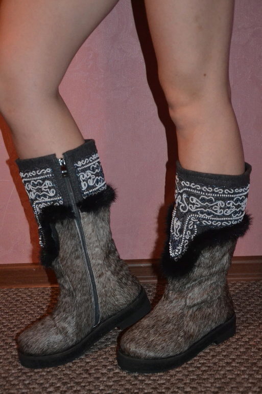 Women's fur boots mainly to the knee, so the number of skins for their manufacture is limited to 7-8 pieces. Women's pima are always tied to the belt. The pattern on them is much lower than men.