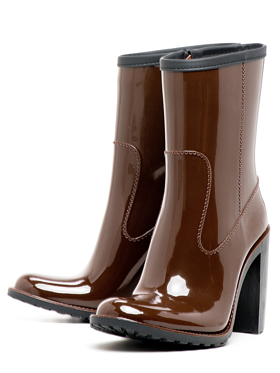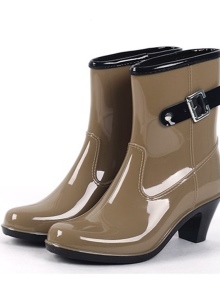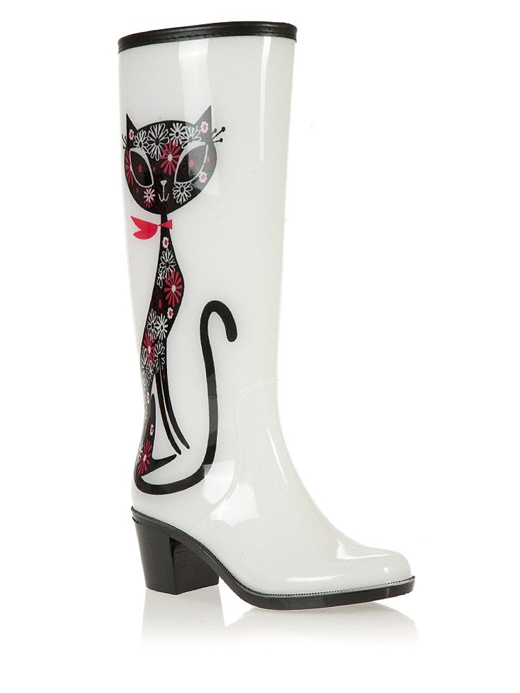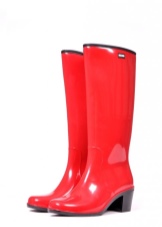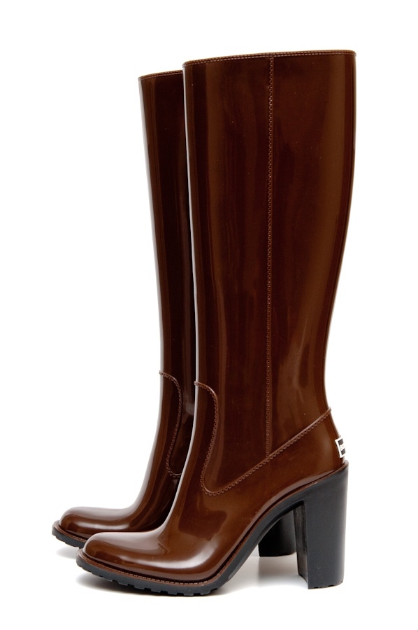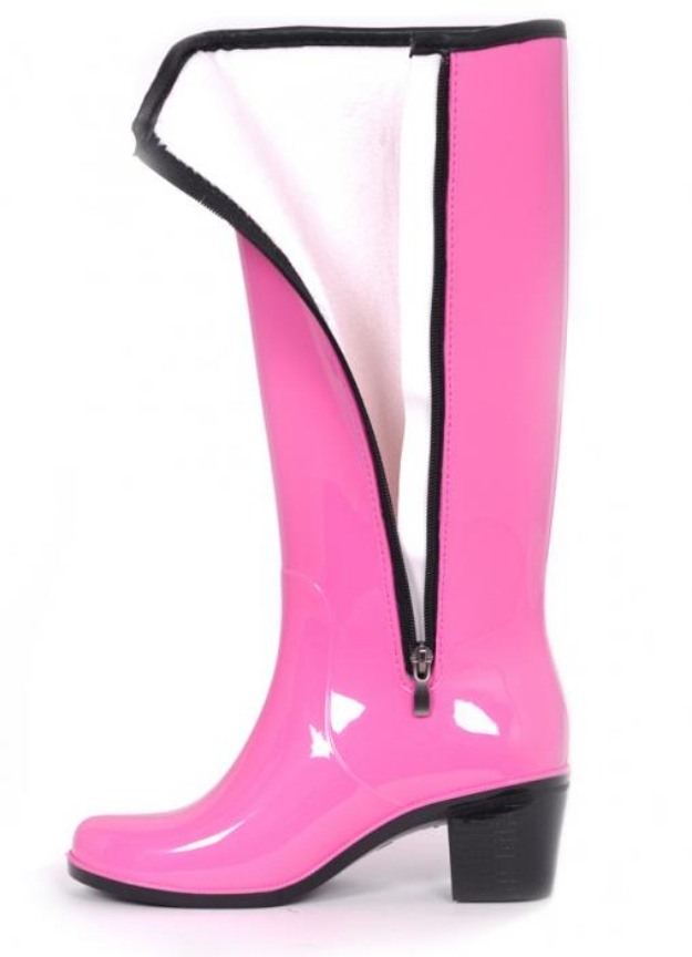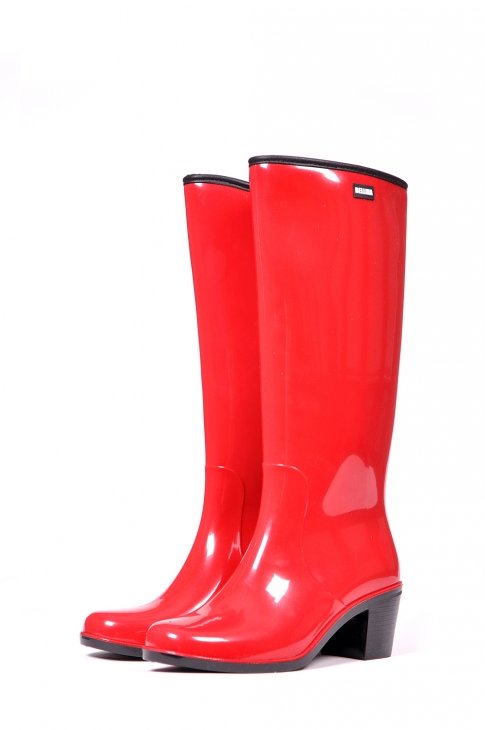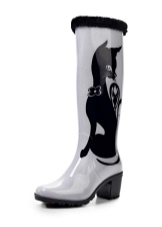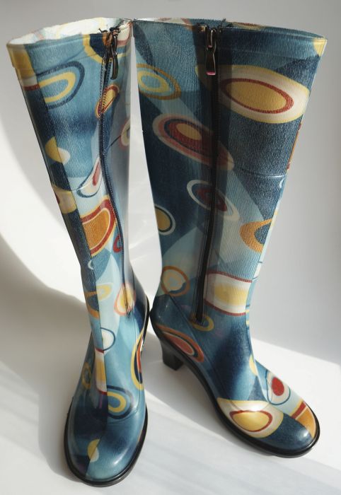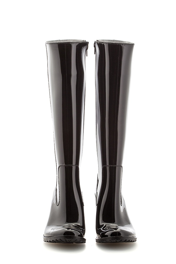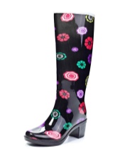 Some experiment with the heel: it can be high and thin or medium and stable. Square low heels make rubber boots very comfortable.