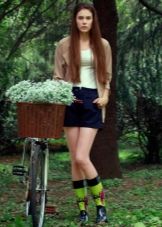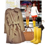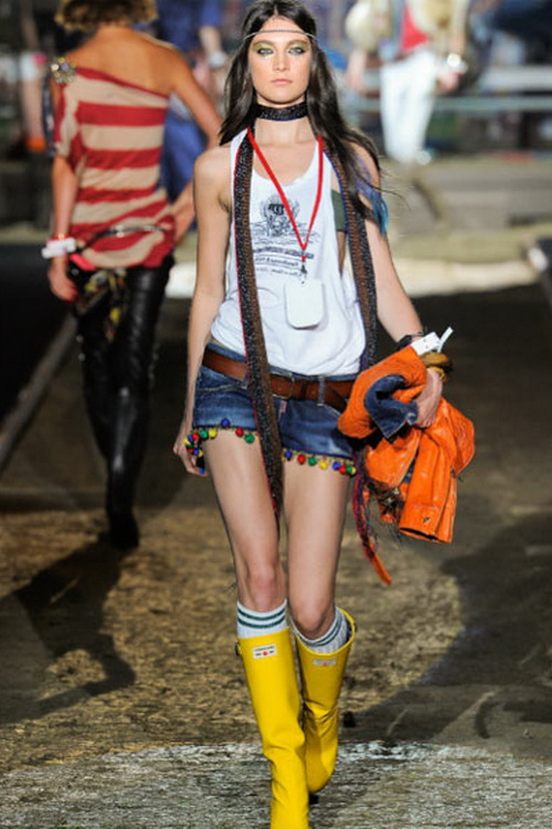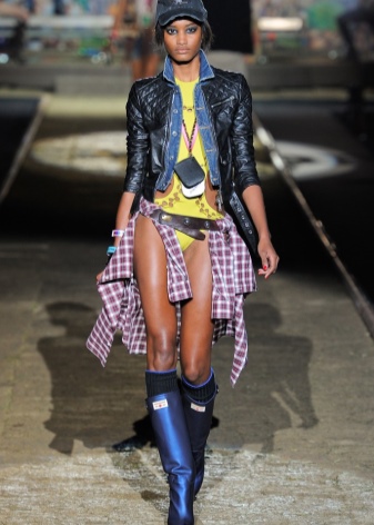 Another interesting combination with rubber boots will be denim or other shorts. Boots to them should choose either to match the chosen wardrobe, or you can combine denim shorts with yellow boots with heels.