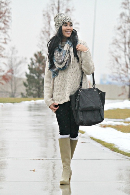 A win-win option in the image with rubber boots with heels will be jeans and pants tight-fitting silhouette. This can also be attributed to leggings and jeggings, which look great with rubber boots with a wide shaft.