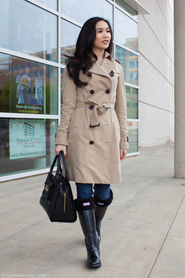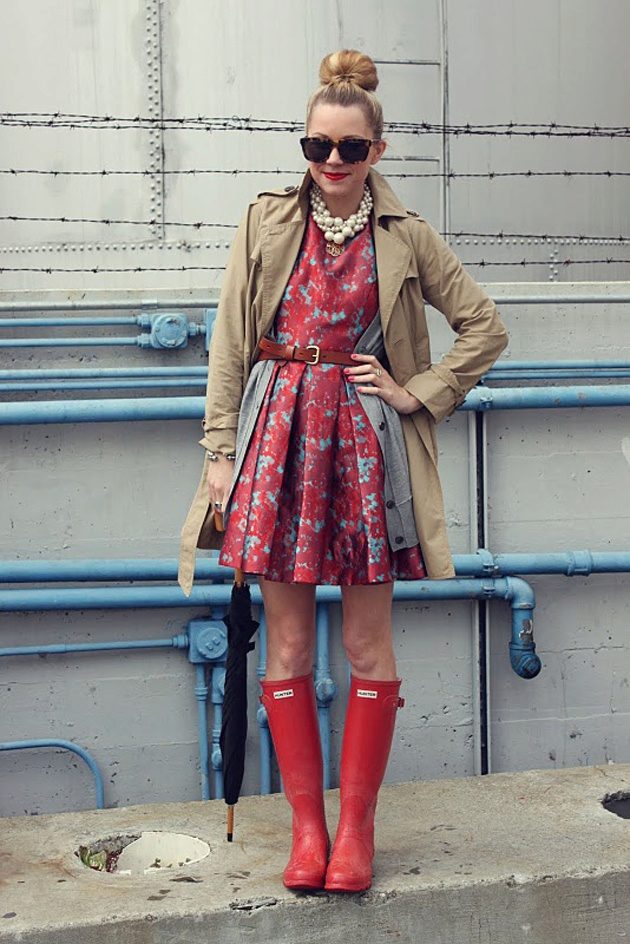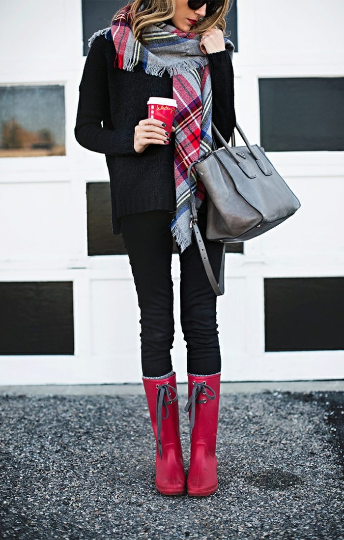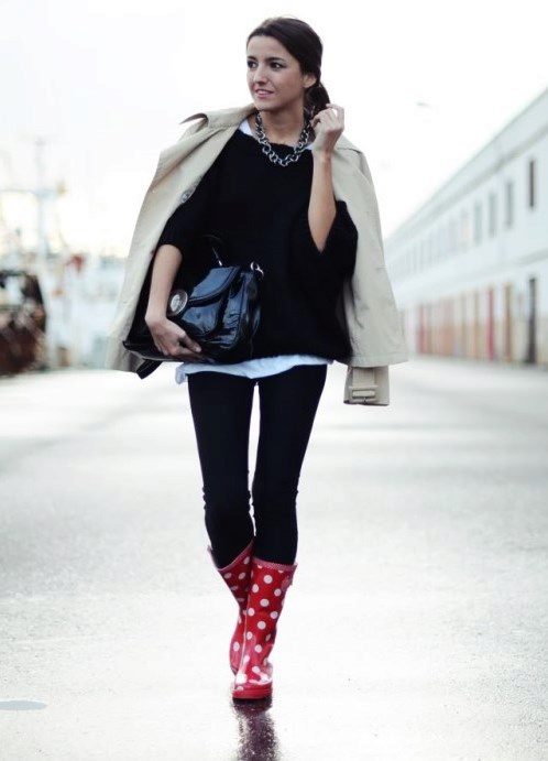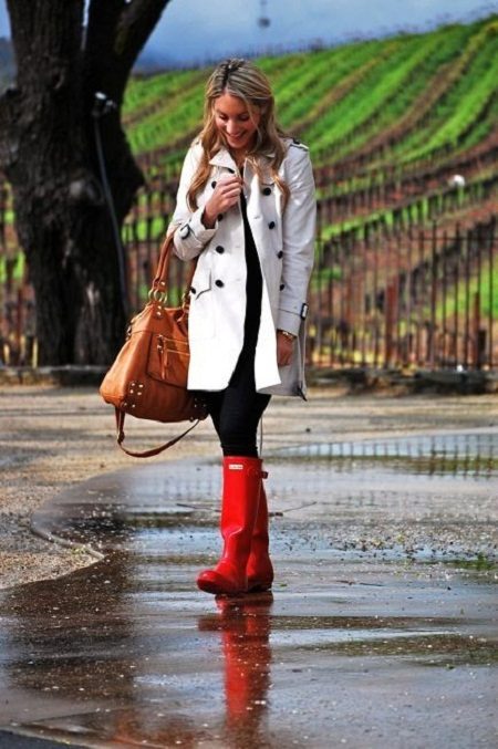 Bright red rubber boots with a slightly lowered shank fit perfectly into the trendy autumn ensemble. Black narrow trousers are tucked into the boots, an elegant snow-white raincoat with black decor acts as outerwear.White-red color scheme is guaranteed to cheer up in rainy weather. Rounding out this positive outfit is a tote bag that blends in shades with the fashionable woman's hair.