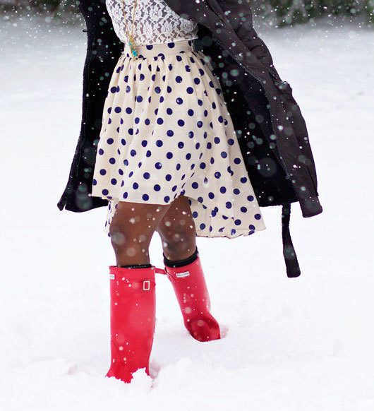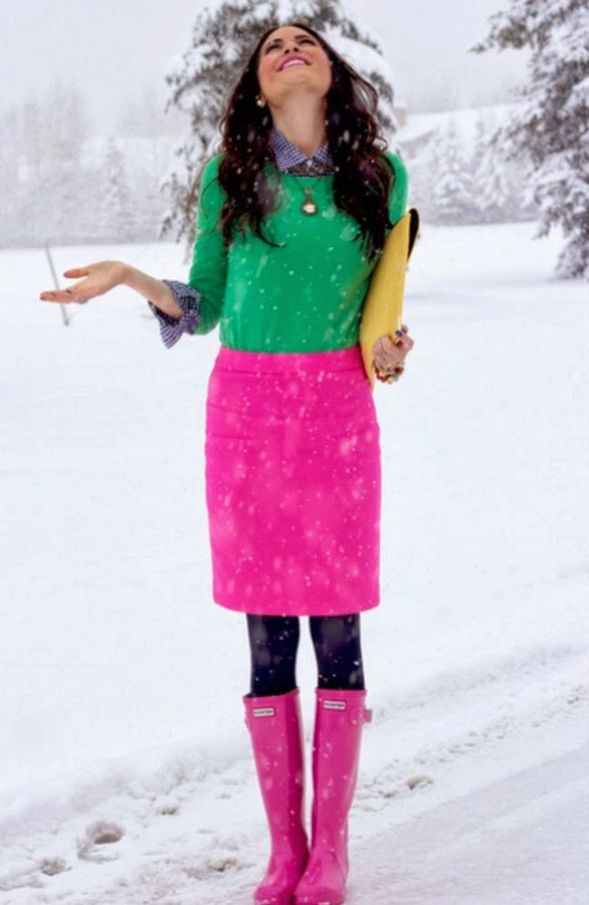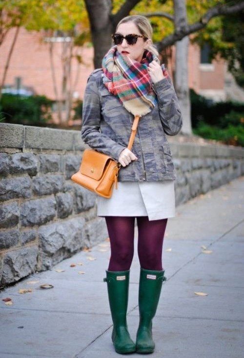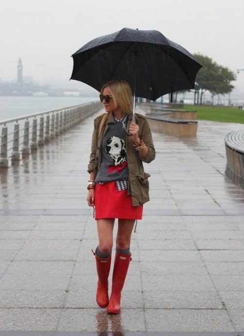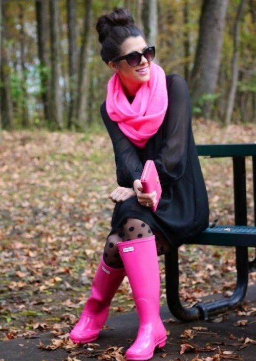 It is quite possible to wear a skirt or a dress with rubber boots, while at the same time with short dresses combine shoes with heels, and with long ones - options on a platform or a flat sole. At the same time choose tights monophonic or color - depending on the color of the shoe.
