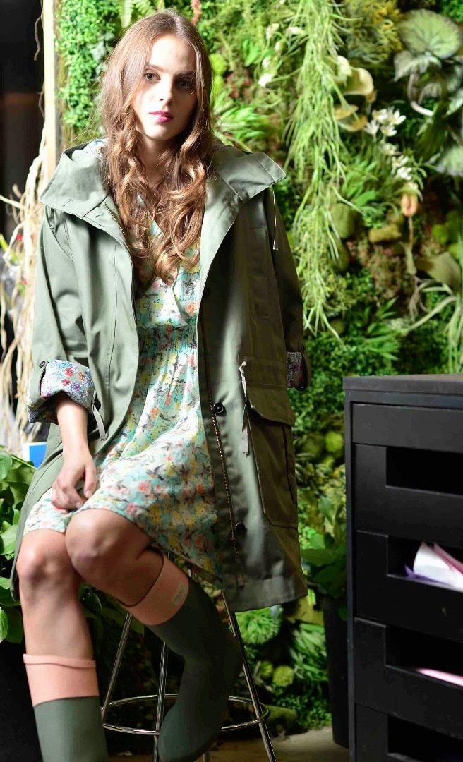 Very stylish urban look. Its highlight is a short dress in folk style. This dress is complemented by a light beige windbreaker and dark mocha tights. Fashionable details of the ensemble are large knit scarf and black rubber boots with a flat sole, the most fitting legs. The footwear has a discreet decor in the form of a miniature buckle and a white logo. A striking accent of this youth image is the yellow bag package.