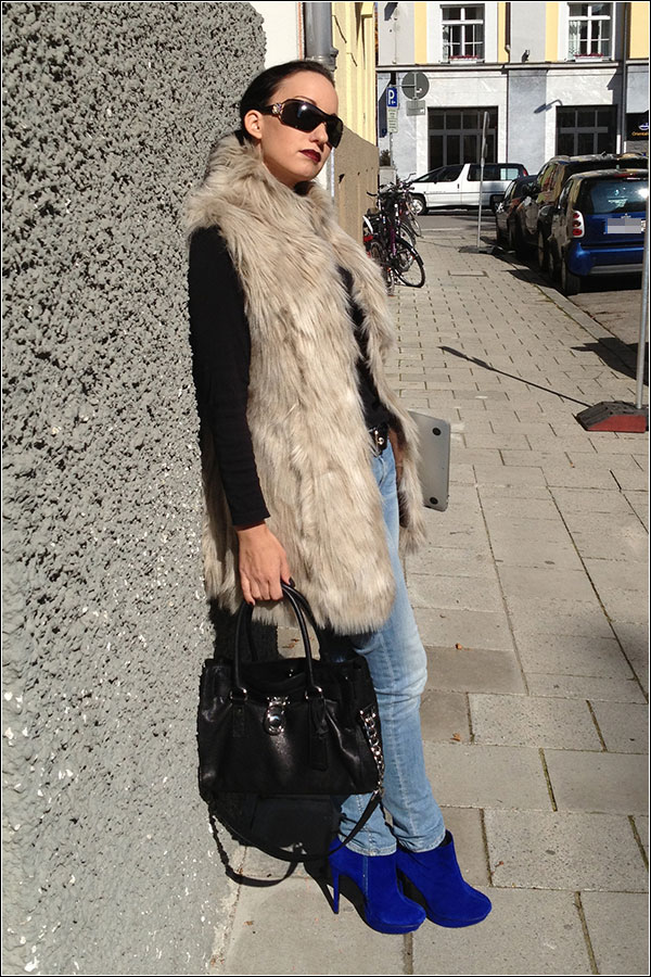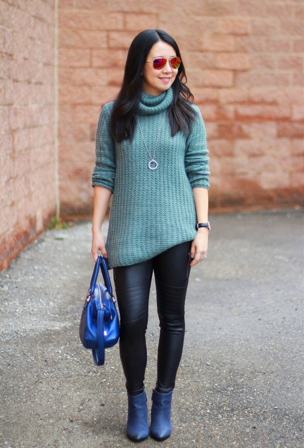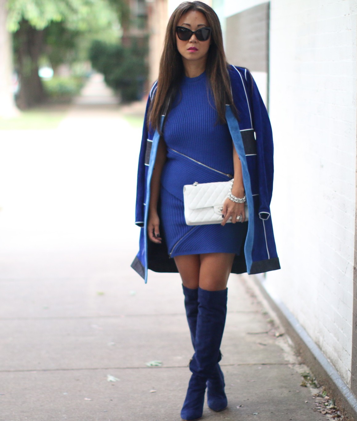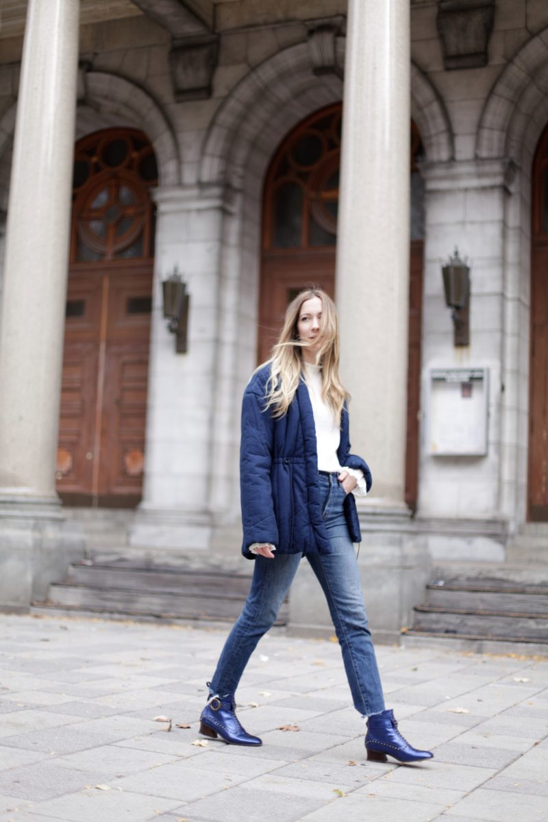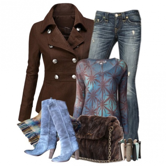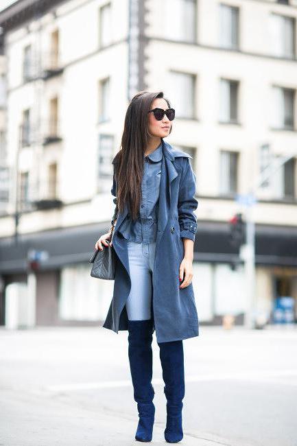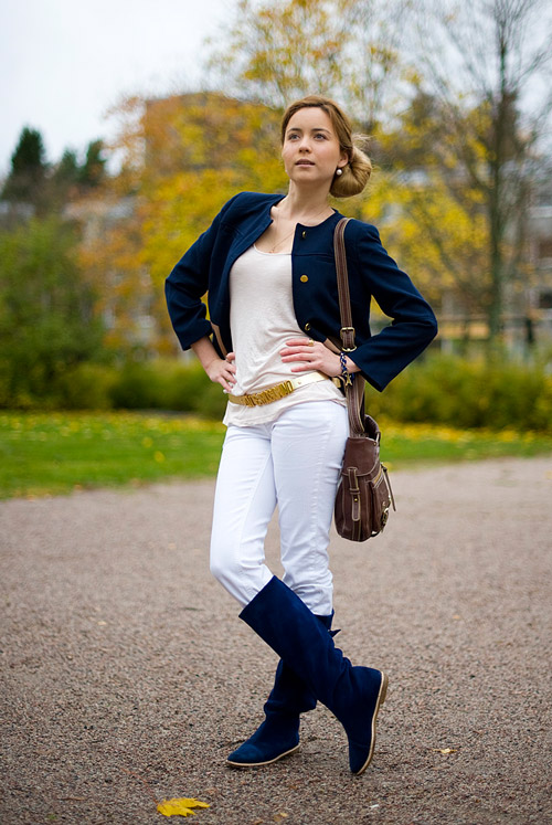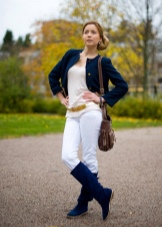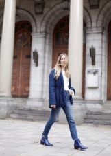 Dark blue shoes look very stylish with classic jeans. If you want to create a more contrasting and bright image, then you should find in your wardrobe trousers or a jumper of delicate flesh color. To highlight beautiful boots, this outfit can be complemented by a flirty handbag in the color of the shoes with a shoulder strap.