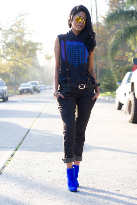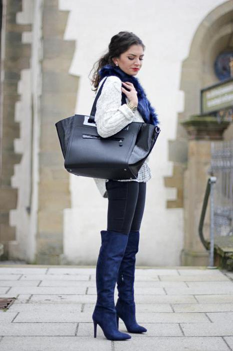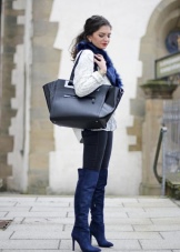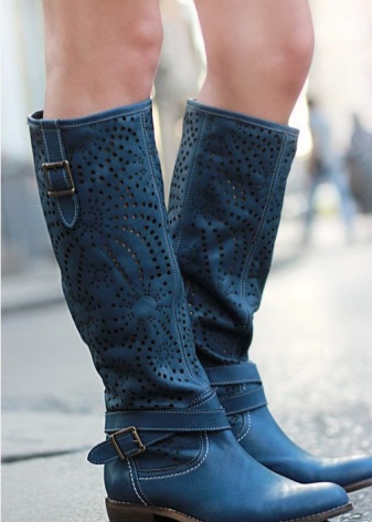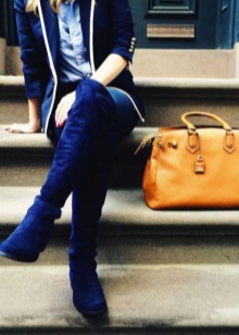 Bright models are sure to attract the attention of others. Choosing an outfit, it is worth starting from the blue boots. In the case of such a product, clothing will be selected under the shoes, and not vice versa. Do not be afraid of this fact, since many types of clothing are suitable for saturated boots.