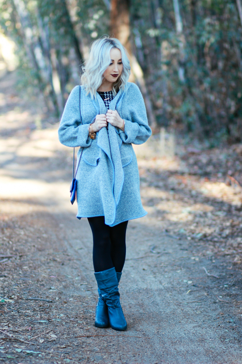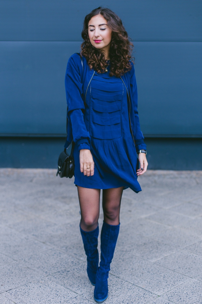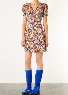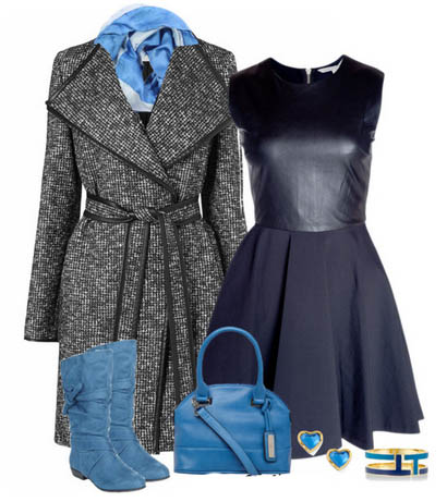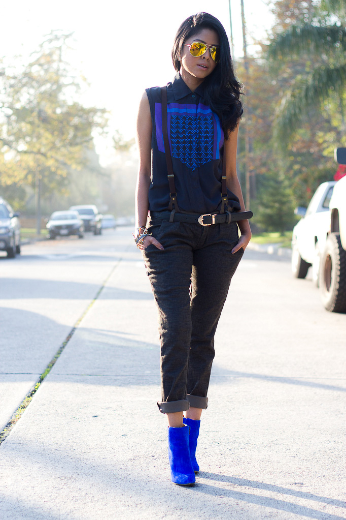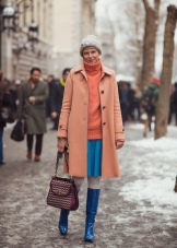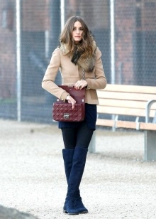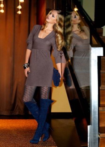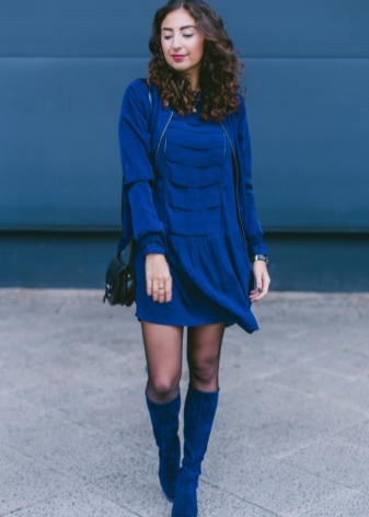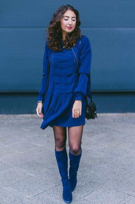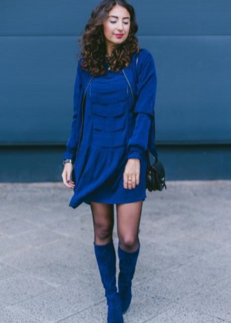 When choosing shoes with a bright shade, you should choose more neutral clothes. You can wear eye-catching suede boots and a classic black dress. To complement the outfit, you can use the blue belt at the waist and clutch in the color of the shoes. Black dress is quite possible to replace the thing beige shade, complemented by a pastel cardigan.