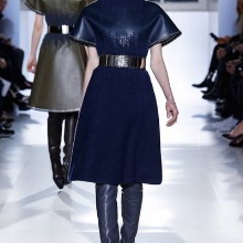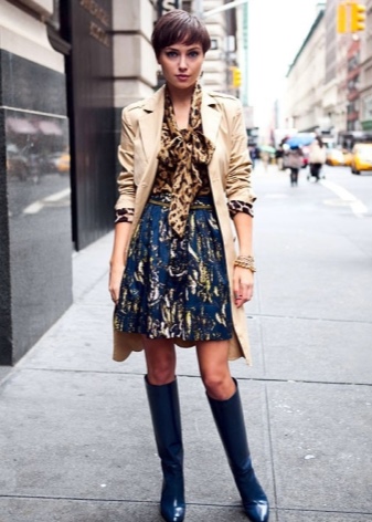 Leather boots of bright color should be combined with cocktail dresses of dark blue, black, beige or emerald color. The blue color is in perfect harmony with the yellow color, but such a tandem should be diluted with accessories and outerwear in soothing colors. With leather jackboots, you can wear a short sexy dress, provided that the woman of fashion has a slim figure.