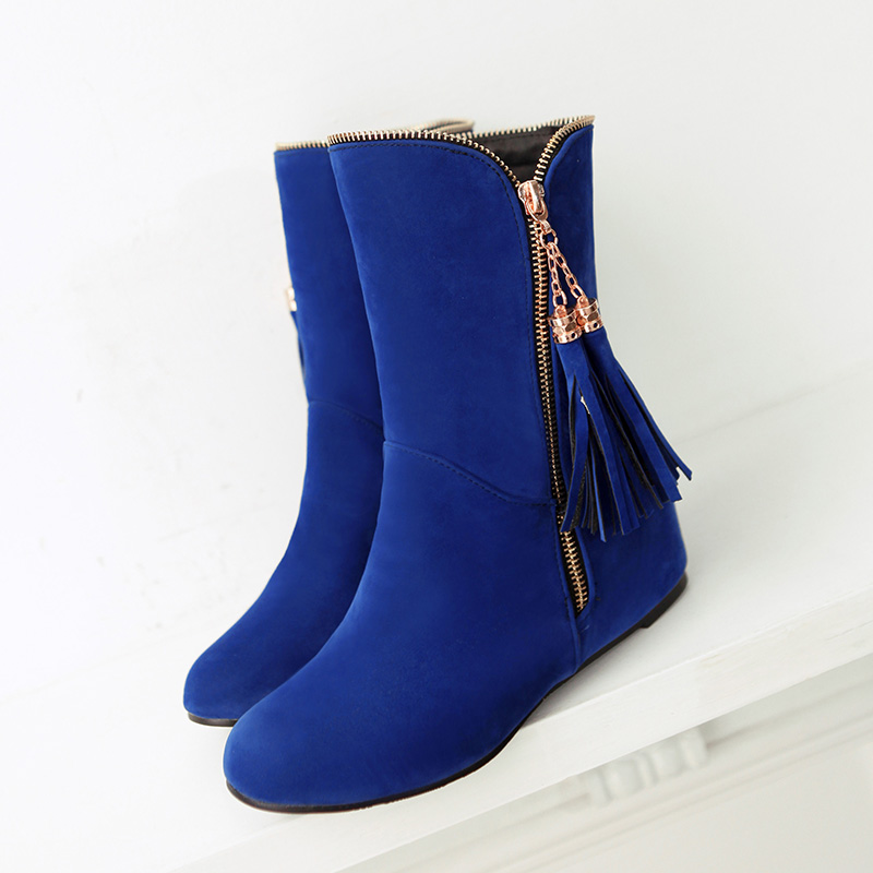 Solid dark blue velvet suede boots are the perfect solution for a classic and austere business attire. Calm color is able to fit into many stylish sets.