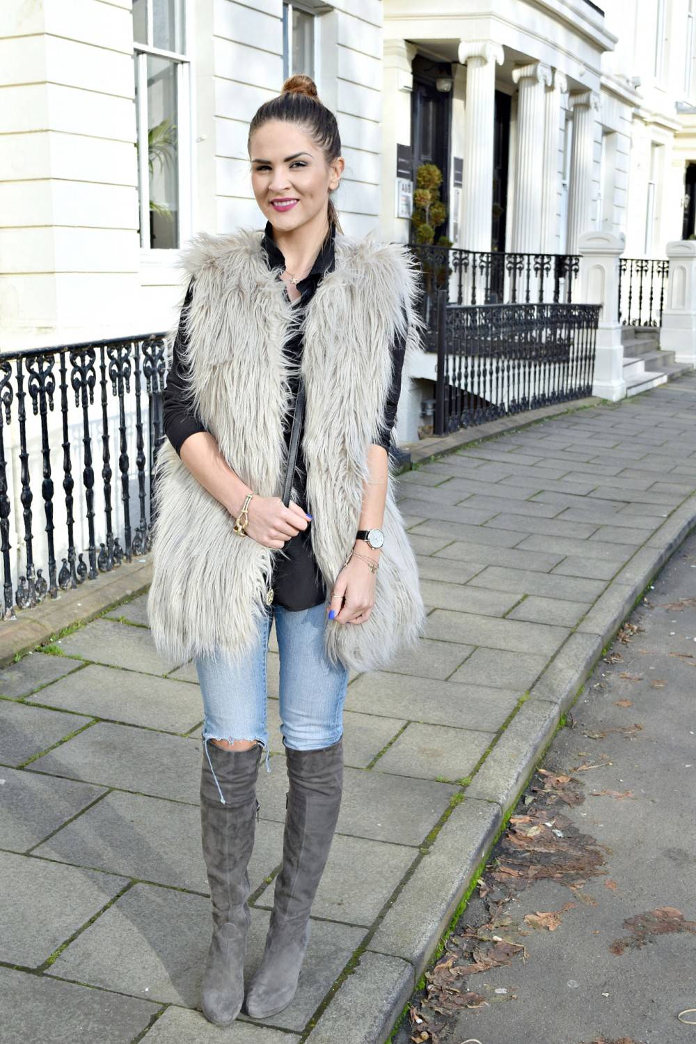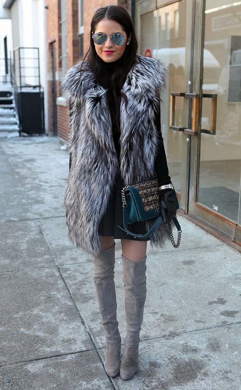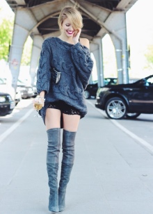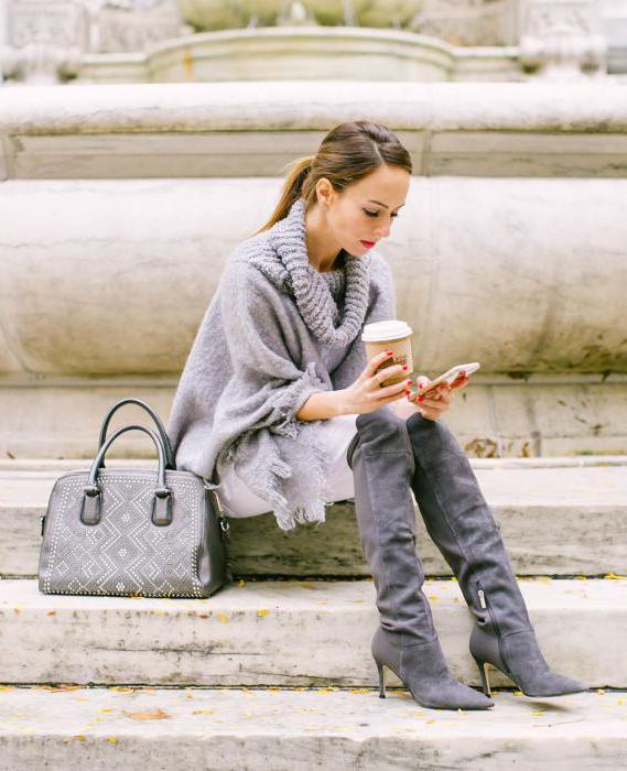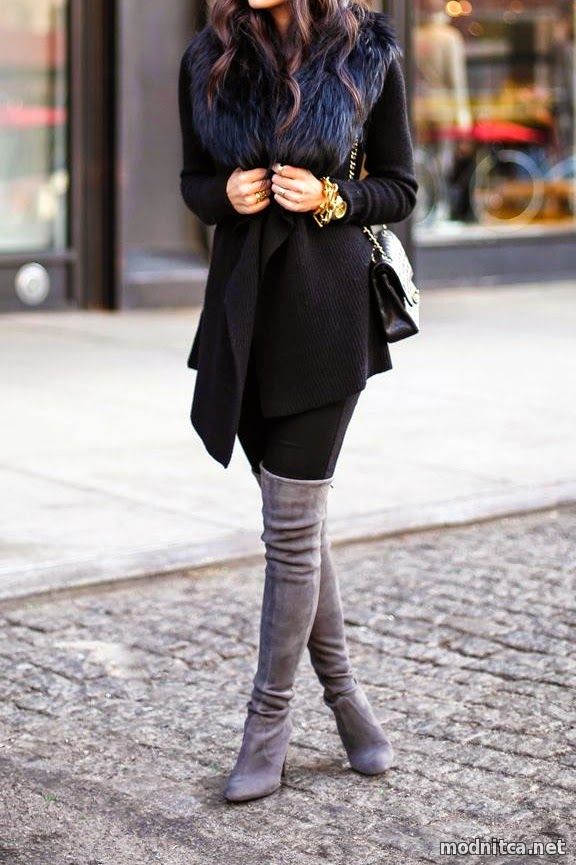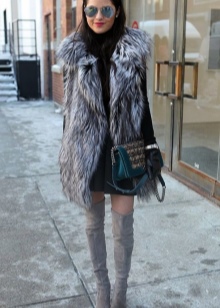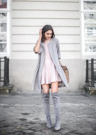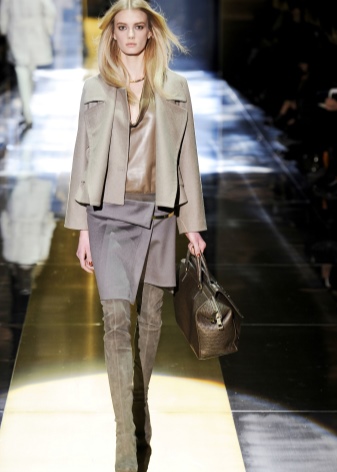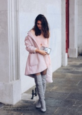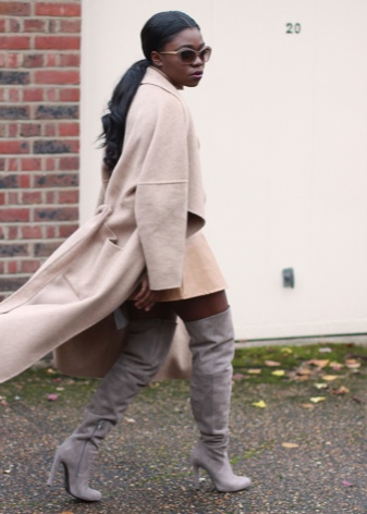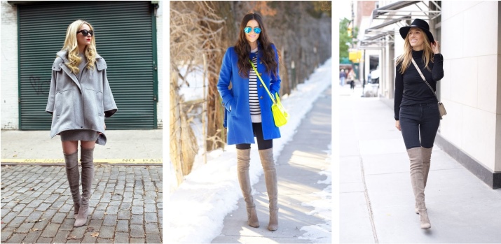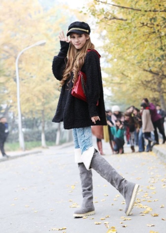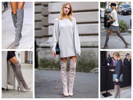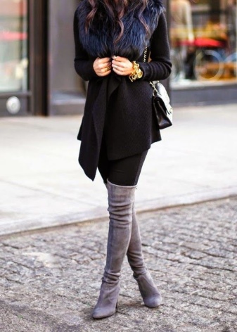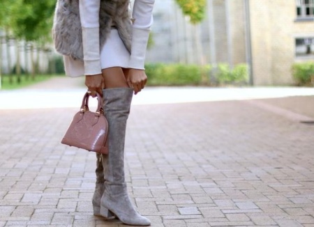 Suede boots are ideally combined with a coat of various styles, for example, trench coats and oversize. With a leather jacket, you get an interesting bow that combines both biker boldness and femininity thanks to the delicate texture of suede. Gray shoes most favorably emphasize the beauty of fur products, made in gray-white and gray-black shades.