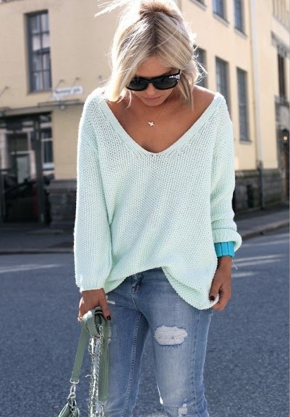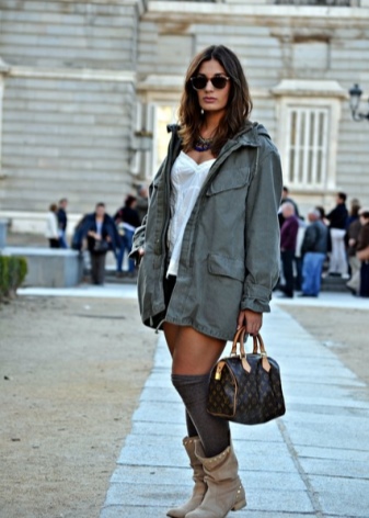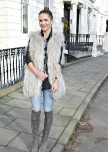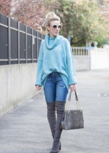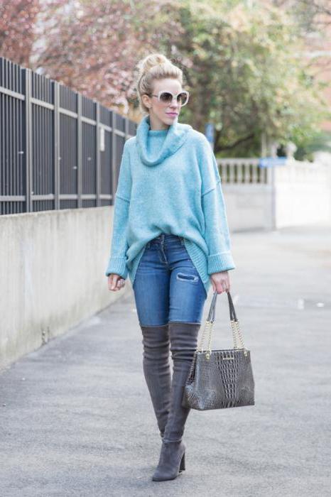 The most comfortable and practical option for every day includes a combination with jeans. Their style may be different, chosen for each specific pair. So, with low boots, boyfriends would be appropriate, and with high boots - skinny. From above you can wear loose shirts and T-shirts as well as smart tunics, blouses, sweaters.