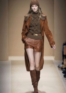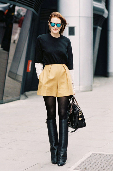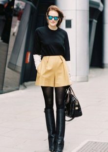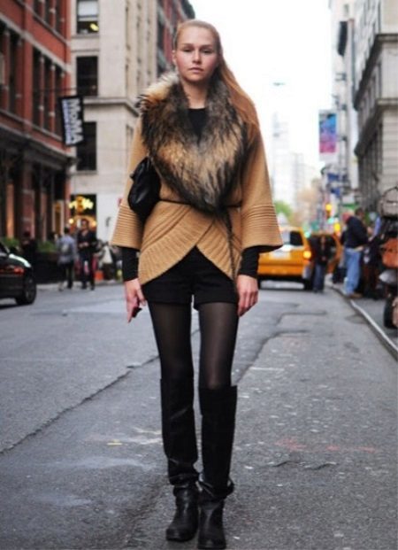 A good option will make shorts, worn on thick opaque tights, and boots, pipes. It is important to remember here that it would be nice if the color of tights and boots coincided. So you will visually appear higher, and your legs will seem simply endless.