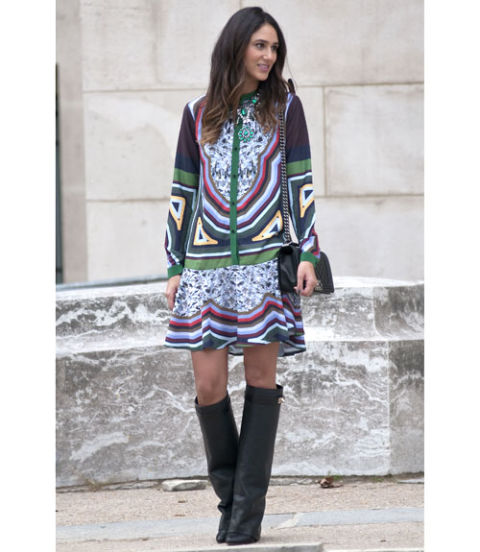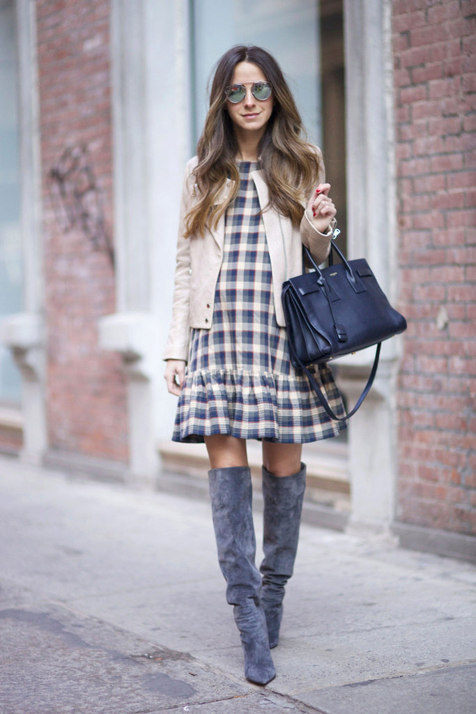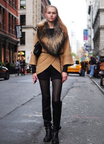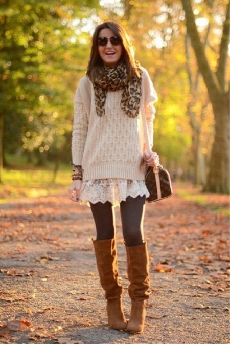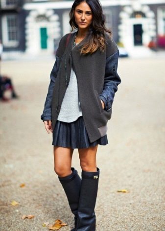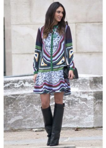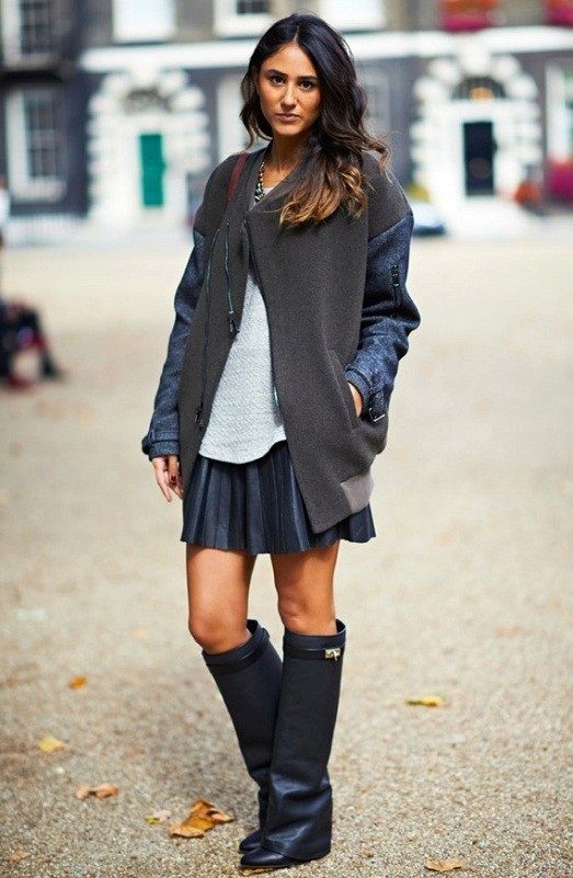But if you really, really want to wear such boots, clothes can help here. For example, a multi-layered version of a short skirt or knee.
