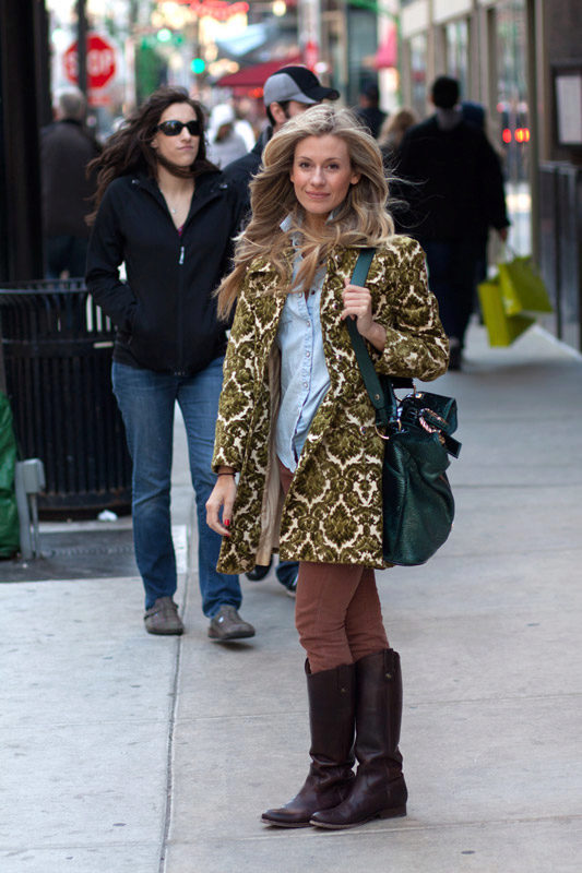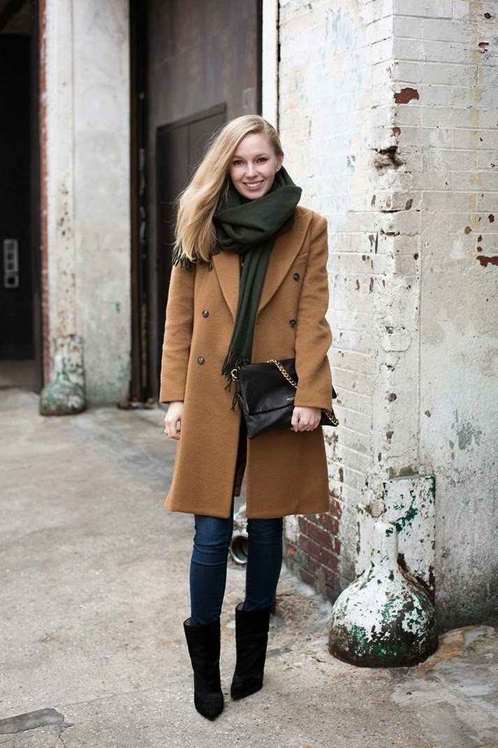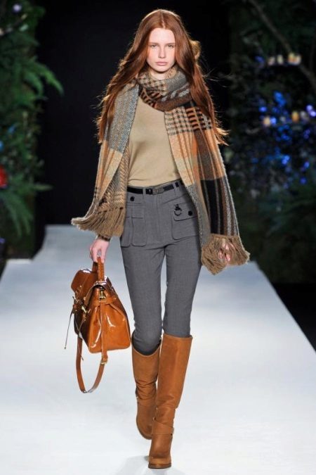 Another daily option. Tight pants tucked into boots that are almost the same tone as the bag. The upper part is lush due to the cape-scarf. All in gray-brown tones. Stylish.