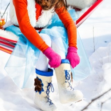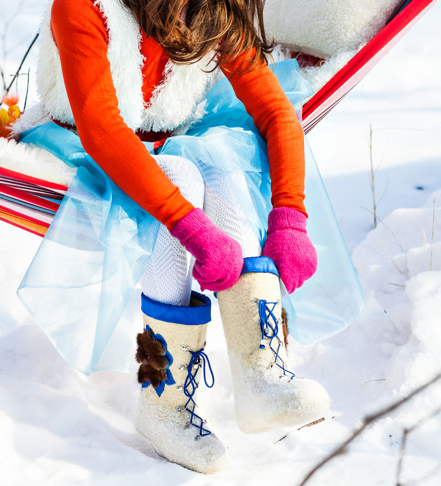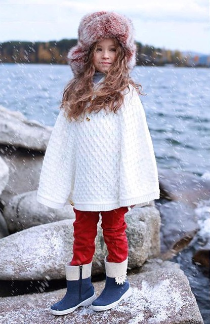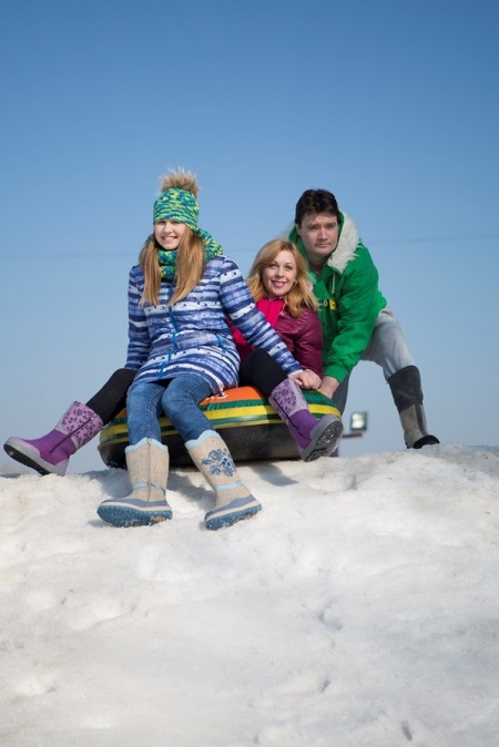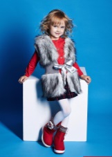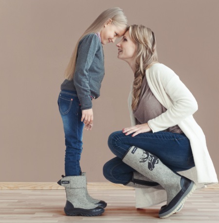 - Children's boots. This is the whole direction in the world of shoes for winter wear. Shoes are made a little different, taking into account the size of the model and the flexibility of the sole. Valenki on children are sewn with the expectation of children's activity, so the models most often have a shortened appearance. It is possible to wear such shoes both during the winter frosts and during the cold season during the deep off-season. Children's winter bow provides jeans with warm tights under the bottom, a warmed jacket, a warm hat with a scarf, mittens or children's gloves. It is worth choosing felt boots from an unbleached wool of natural shades.