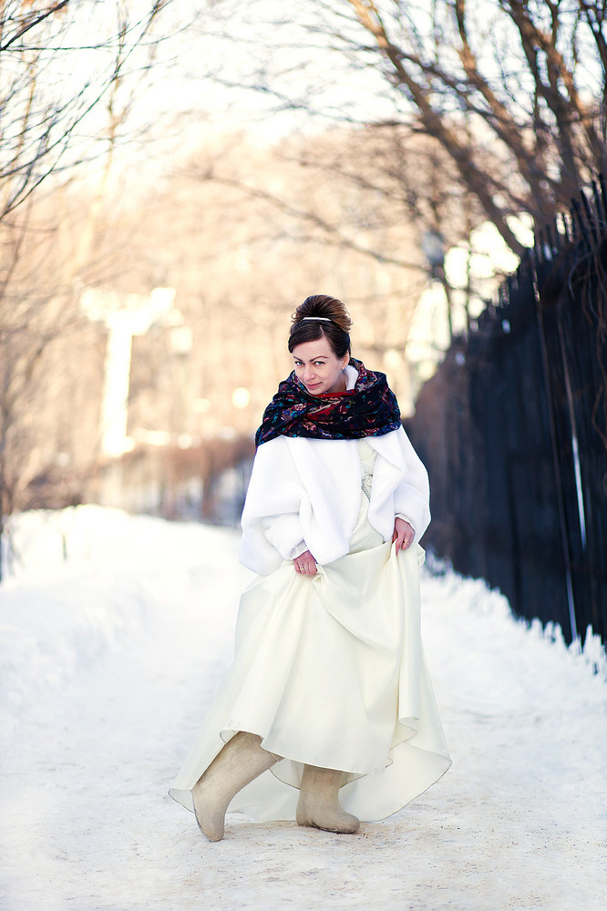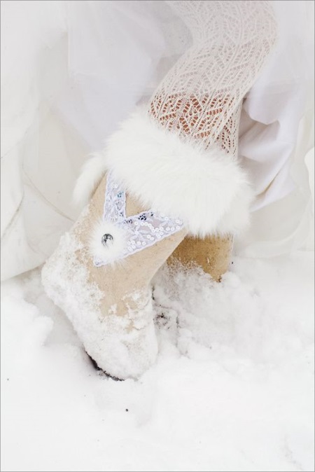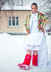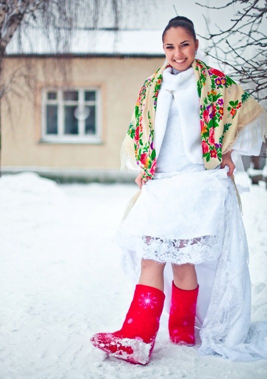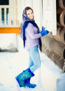 - Boots boots with a thin sole and decorative embroidery. You can wear them under a sheepskin coat and with tight tights. For the winter, you can choose a brighter model with an unusual design. For example, snow-white felt boots can be framed with lace. Pure white shoes are easily matched with denim. Moreover, a pair of jeans looks good in pairs. The same applies to sheepskin coats, without which it can not do in a harsh winter. Outerwear can be matched to boots-boots. White fur looks very impressive as a decor on such boots. Felt shoes are usually associated with flat sole and lack of heels, but designers, as usual, decided to break stereotypes here too.High heels or wedges on felt boots now look quite appropriate with bright insulated jackets.