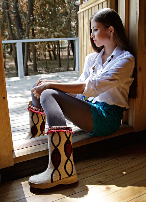 Interesting decor and decoration on felt boots or modern felt boots looks quite organic - embroidery, patterns, beads, lace, decorative elements, decorations in the form of zippers or zippers, fur and appliqués. The result is a trendy trend footwear with a quality sole on a comfortable shoe , with warm insoles that protect from the cold.