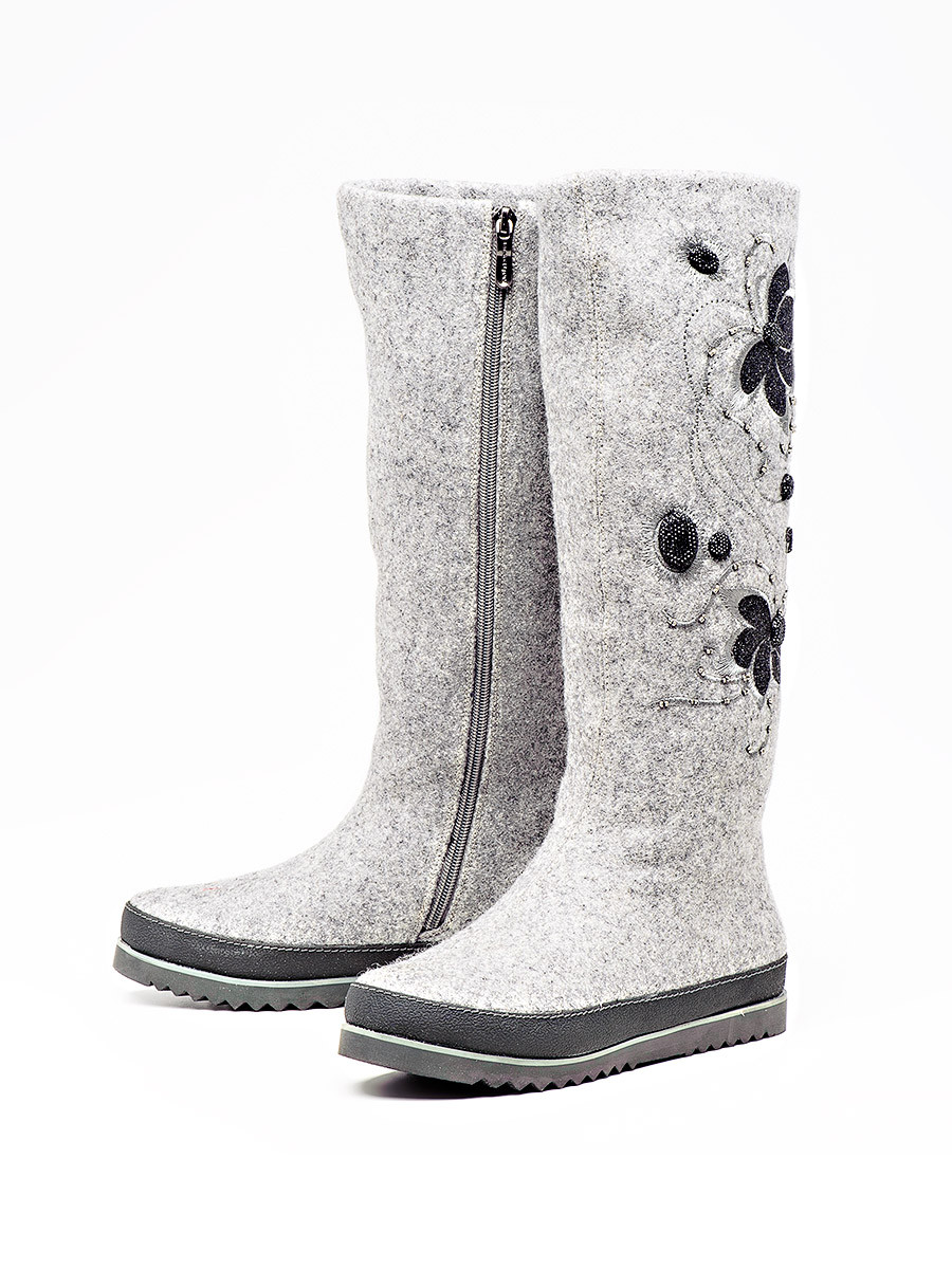 There is something attractive in the image of light gray felt boots on a solid sole, decorated with neat embroidery stitching. The sole of the shoe is solid, non-slip. Embroidery makes shoes elegant, harmonious. In these boots you can go for a walk in the park, your feet will be securely insulated.