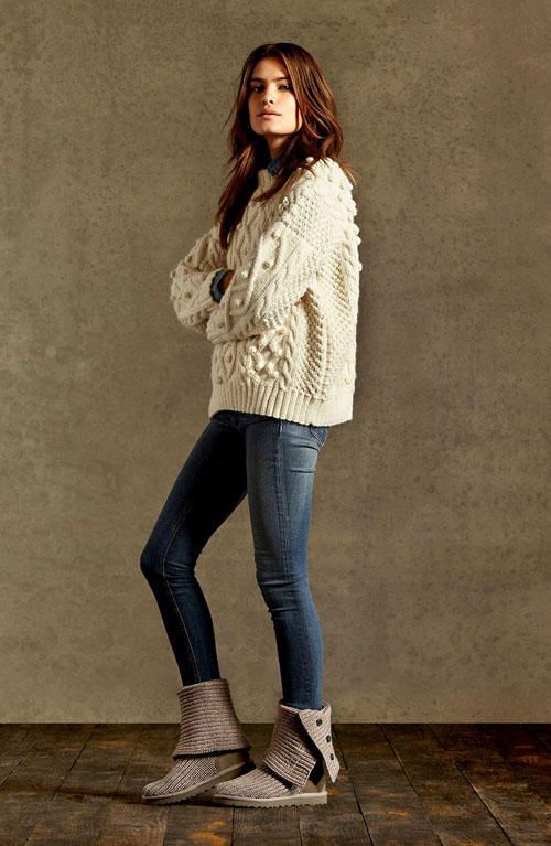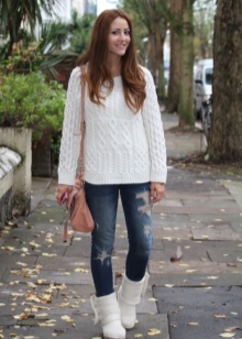 Jeans, already so familiar to modern girls, can also be combined with knitted boots. In this case, narrowed models are chosen so that you can hide the leg in the leg.