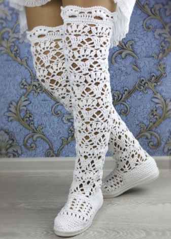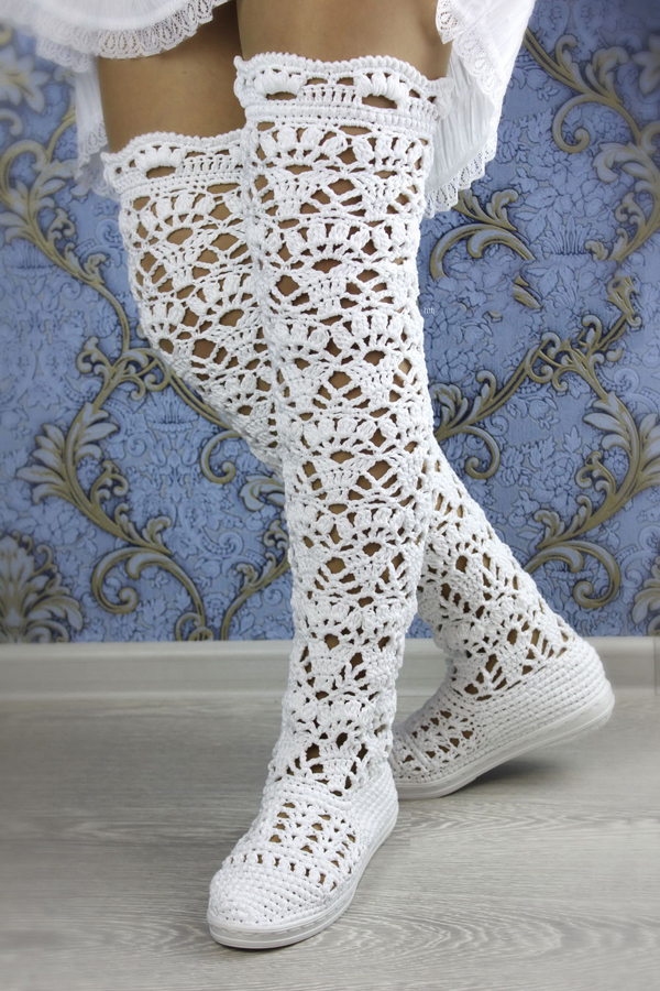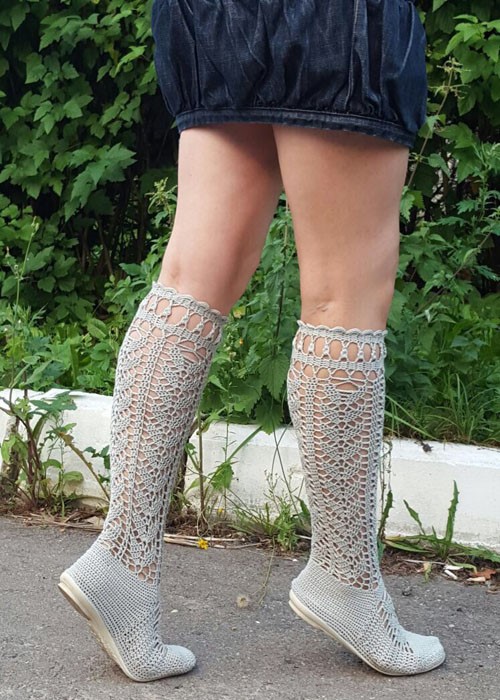 It is believed that the fashionable ladies of Japan wore the first summer knitted boots. Then they became popular around the world, appearing on fashion shows, magazines, and films where the heroine wore boots in any weather. Not surprisingly, today in the wardrobe of almost every girl who follows fashion, there is a pair of such shoes.