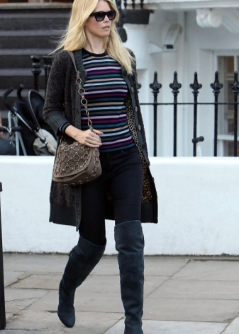 Black suede boots will visually make ladies' legs more slender. For this reason, these shoes are very popular among ladies. To enhance the effect, you can wear tight dark tights, skinny or leggings. Owners of a fragile figure should refuse such footwear.