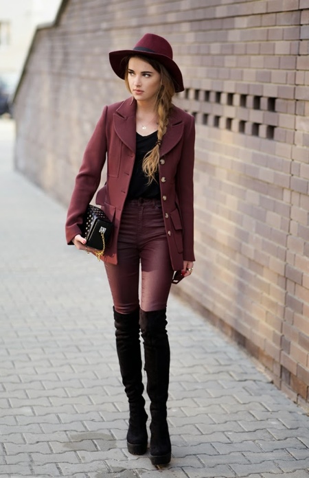 To create a feminine and bold image perfect bright boots rich burgundy color. Such shoes will be in harmony not only with the usual outfits in the urban style, but also with contrasting dresses and short dark skirts. Such models will emphasize the elegance and delicate taste of stylish women of fashion.