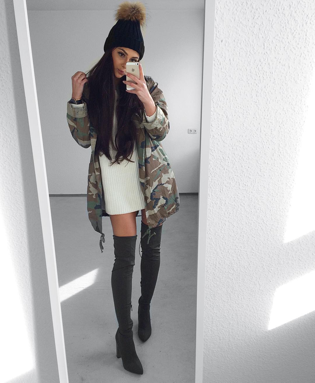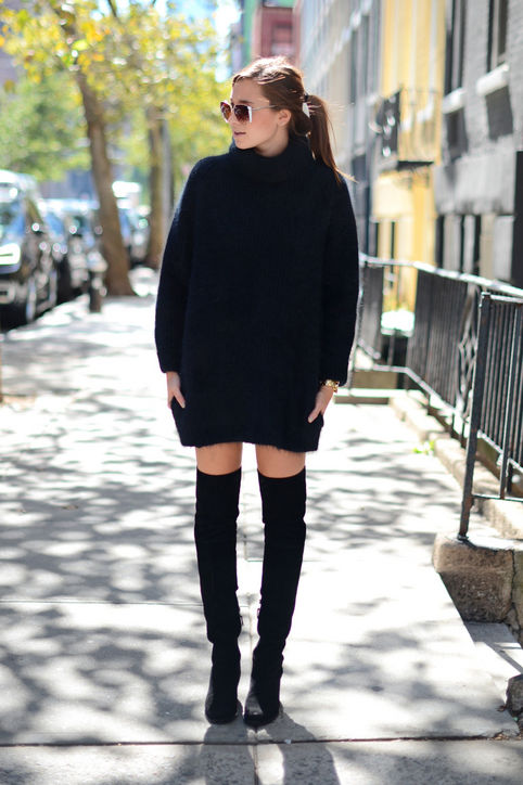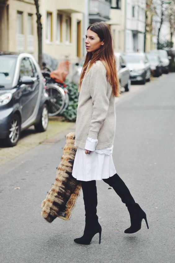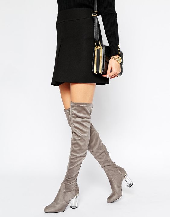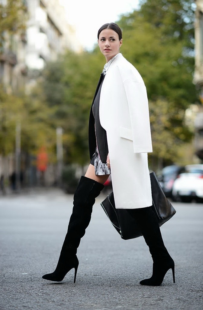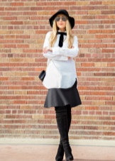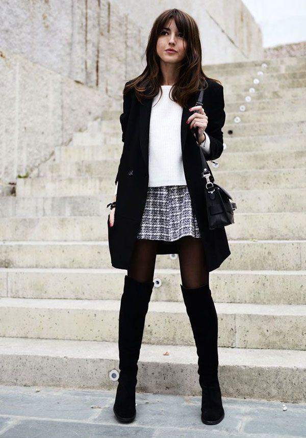 - A bold combination of beige or black over the knee boots and a short leather skirt with a straight or wide cut is very impressive and sexy.