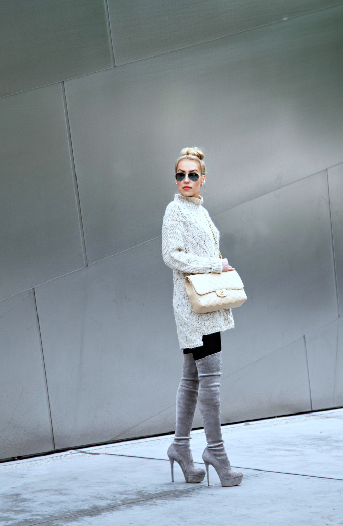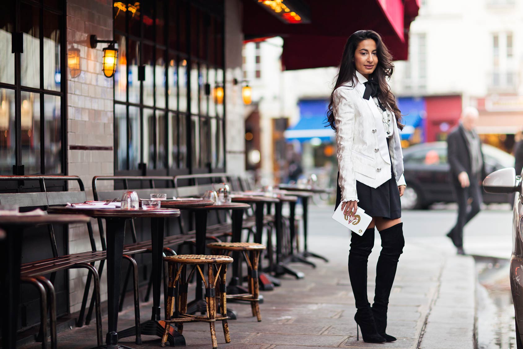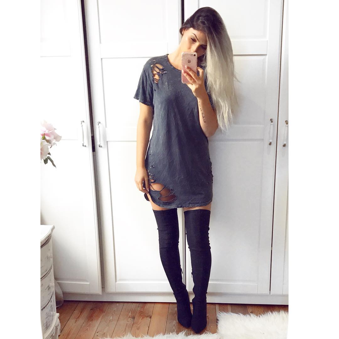- A bold combination of beige or black over the knee boots and a short leather skirt with a straight or wide cut is very impressive and sexy.