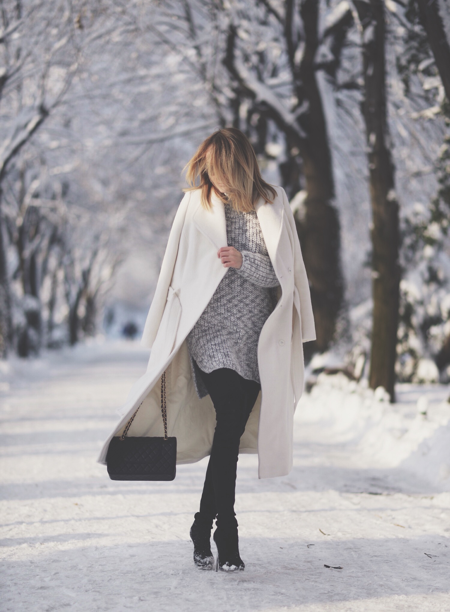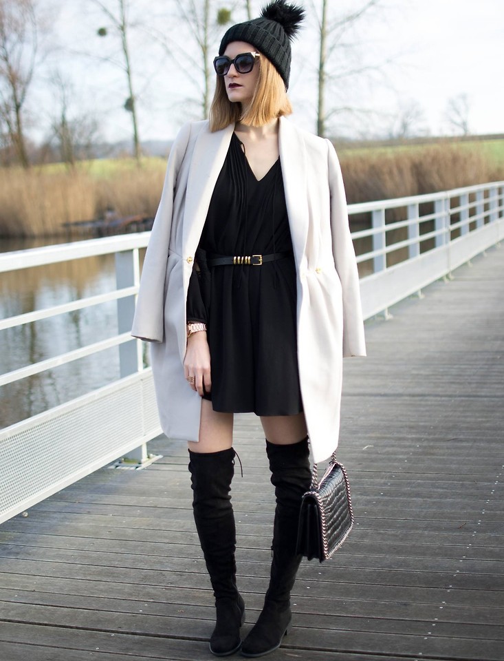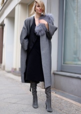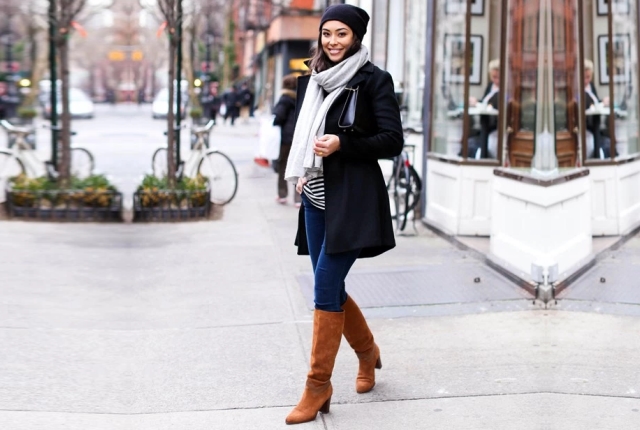 You can make a slimmer figure with the help of high-heeled boots, a straight monochromatic dress and a fitted coat. This outfit visually pulls the figure and makes it more elegant.