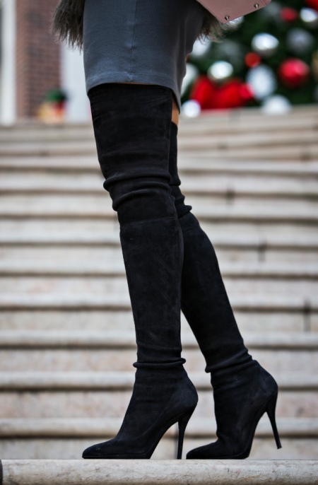 Suede boots with heels look incredibly sexy! With such a spectacular shoe you should not wear too explicit outfits, otherwise you risk creating a vulgar image.Long boots, reaching to the hip line, will be a bright solution for the owner of a slim figure.
