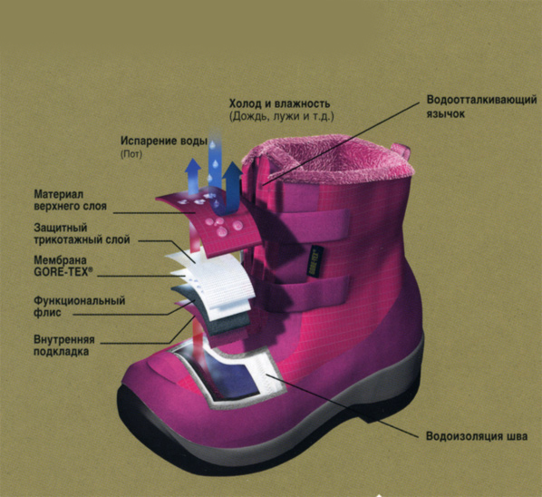 In order for membrane tissue to fulfill its purpose, it is necessary to be in motion. If you stand in the cold in such shoes, your legs will quickly freeze. Another condition for the correct operation of the membrane is the use of synthetic socks. In woolen or cotton socks that absorb moisture, the feet will be damp.