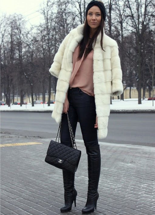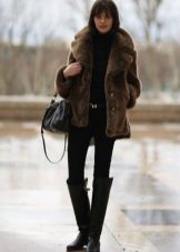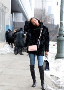 A short-sleeved fur coat creates a monochrome classic bow, along with high leather boots with a thin heel. Under a fur coat light peach blouse, dark blue fitting jeans. There is a black bag on the chains and a black hat-turban.
