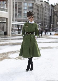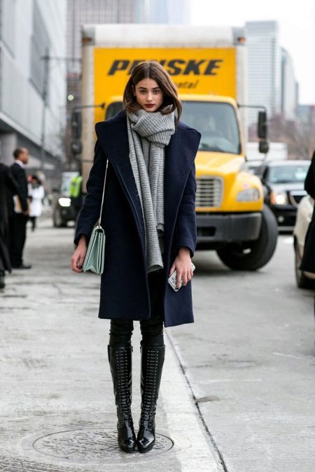 In the warm winter you can afford to wear a coat. The blue oversize model with large lapels is combined with a long warm scarf of gray color, fitting trousers and high black patent leather boots. The shoes have a pointed toe and a zipper as a clasp, and on the front they are decorated with metal details imitating lacing. The image is completed by a neat handbag on the shoulder.